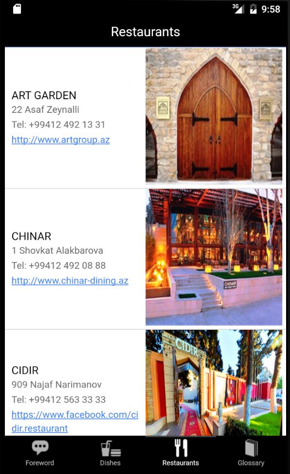 The application is targeting those who are interested in Azerbaijani cuisine. It will help you in cooking of the delicious Azerbaijani dishes, and will also serve as a guide to the guests of the Baku city in visiting the restaurants where they can taste these dishes. Some of the restaurants are located in the historic areas, bringing special touch and enabling visitors to make a journey in the city's history, traditions and way of life of its inhabitants and learn the interesting architecture of Baku.