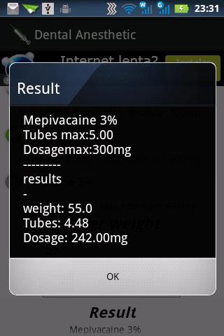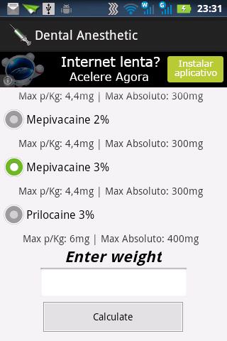 Health professionals have a duty to know the medical history and personal habits of his patients . Dentists should not behave differently . The anamnesis is essential for the correct treatment to be successfully accomplished step . So with a list of questions related to health and well - being of the patient , the dentist is better informed and prepared for the planning of each case . The " Anesthetic Dental " application acts as a helper at the time of application of the anesthetic . From a data obtained in the anamnesis ( the patient's weight ) , and studies concerning the health of the patient ( if he is not diabetic or hypertensive decompensated, if you are allergic to any medication or substance included in anesthetic, if the case is a woman and she’s pregnant ... ) after reviewing each case and choosing the right anesthetic for each patient , the application helps in the correct dosage maximum anesthetic that can be applied , depending on the weight of the case and the anesthetic selected.