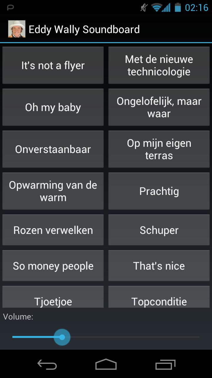 A soundboard with statements from Eddy Wally. Enjoy wonderful statements, such as 'Wauw', 'Djippelein' and 'Schuper'. There are 36 sounds in this soundboard. Amai!