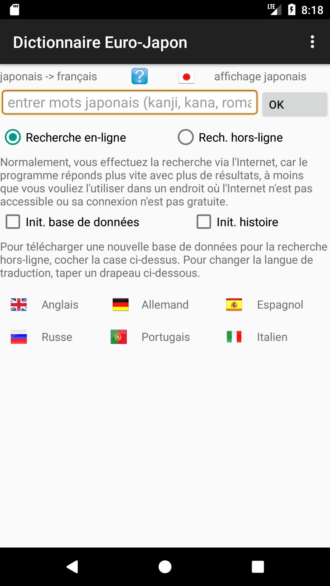 Euro-Japan dictionary is a Japanese dictionary which supports not only 7 major European languages: English, French, German, Spanish, Italian, Russian and Portuguese, but also 2 search modes: online or offline search. The latter is useful when the internet is not available or its connection is not free. Supported input methods are Kanji, Kana and Romaji in Japanese. By purchasing “Euro-Japan Gold” you can freely choose among 7 translation languages (i.e. you can translate Japanese to English, French, German, Spanish, Italian, Russian or Portuguese and vice-versa at will), otherwise you are limited to a local language recorded on your mobile. The default translation in North America, UK and Japan are English, French in France, German in Germany, Italian in Italy, Russian in Russia, Spanish in Spain and South America etc. If this language choice doesn't fit for a free version user, you are advised to modify the display language by launching “Settings” from home screen. You may also grasp the power of this application via a web version at docoja.com because it handles the same database by the same algorithm in online mode.