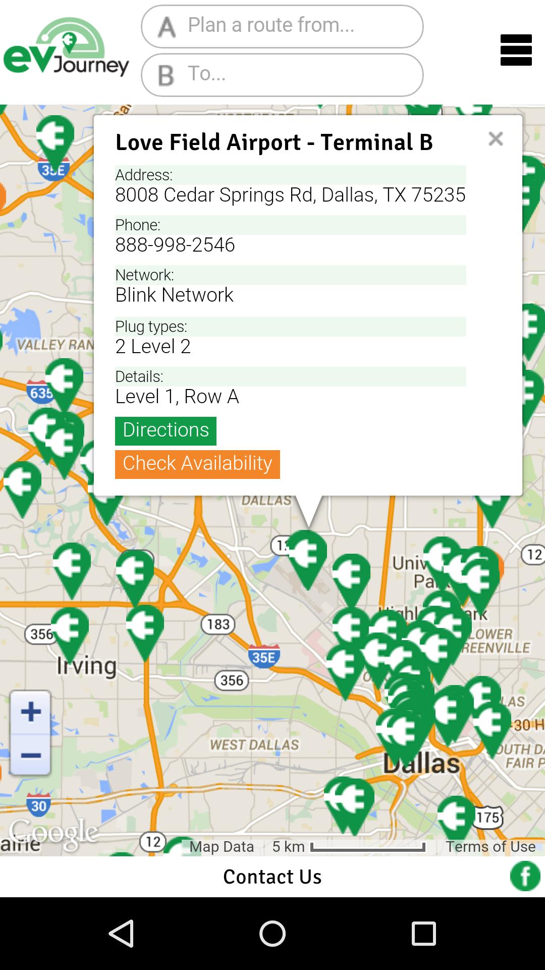 Click on a marker to get details for the charging station. The info window will show name, address, phone number, network and charger types. Clicking on Check Availability displays real-time port use status where possible.