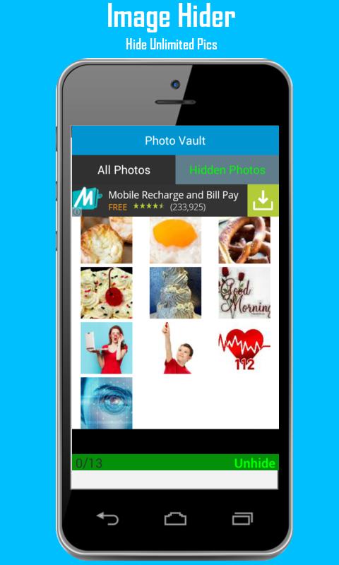 Now you can protect your device image,using Photo Vault Feature you can easily hide any picture from your device.There is no limitation in hiding number of picture,by using this amazing feature you can simply hide 50-60 images in just 5-6 seconds & app can un hide those hidden pic in same time.