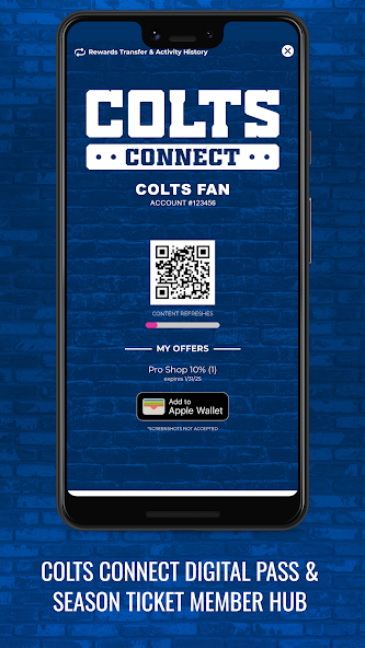- COLTS CONNECT - Fans can leverage their membership by accessing Colts Connect Pass via the Colts app to manage their food, beverage, and merchandise credits, Colts Pro Shop discounts, access to exclusive events, and more.