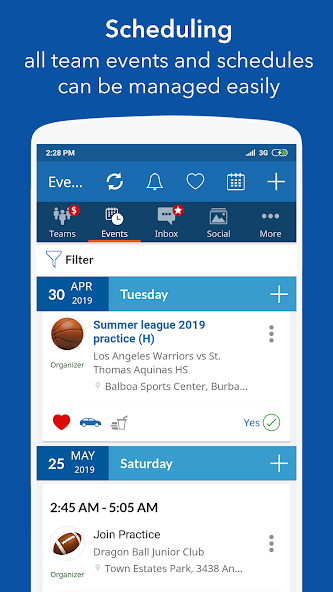 • Events Management: Create multiple events on multiple days or edit events in bulk with just few clicks. Create games, practices, meetings and other events for all your teams in one shot eliminating duplicate work.