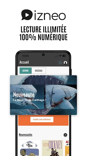 Izneo is a free application to read manga, BD, graphic novels, and comics on smartphone, tablet, PC, Mac and Smart TV. Find a catalog of several thousand albums that you can buy directly from the application. Enjoy a 100% digital reading experience, without advertising and on all your devices.