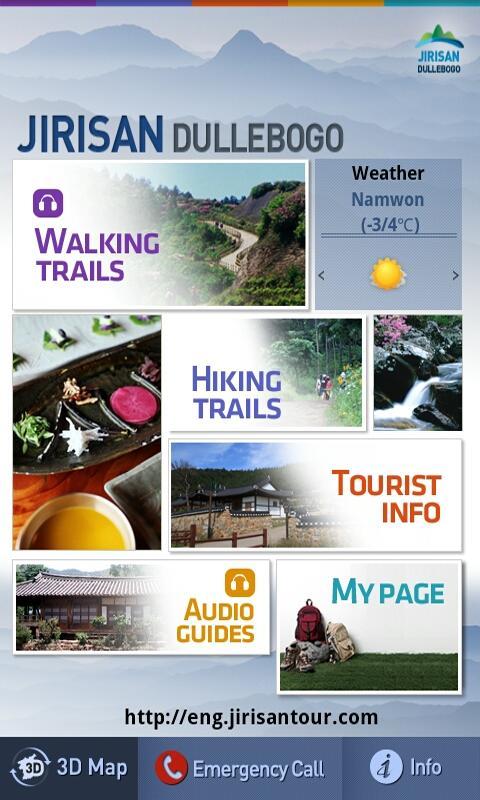 JIRISAN DULLEBOGO is a tour guide app providing comprehensive information on Jirisan Mountain, mp3 audio guides, and emergency call services.