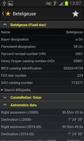 Detailed additional information is available for every celestial object (fixed star, deep sky object, planet, moon, sun, meteorite shower). The information of the Bright Star Catalog and the Washington Double Star Catalog is made available for fixed stars. Additionally, users can add notes and links for every object.