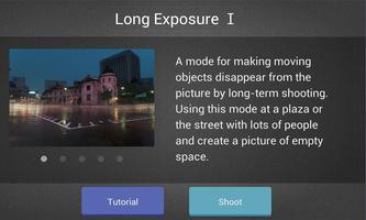 Long Exposure : A mode for making moving objects disappear from the picture by long-term shooting. Using this mode at a plaza or the street with lots of people and create a picture of empty space.