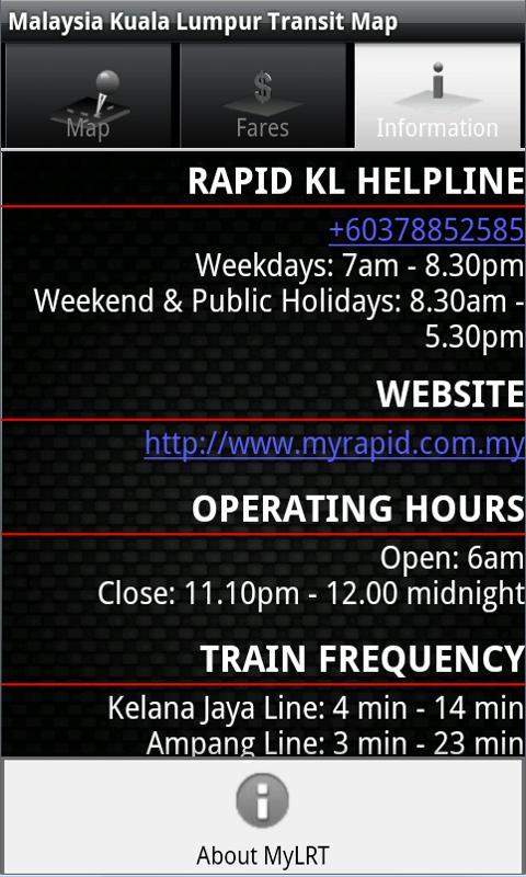Malaysia Kuala Lumpur Transit Map is a mobile application that provides full information of Malaysia Kuala Lumpur Rail Transit System which consists of two Light Rail Transit (Ampang Line and Kelana Jaya Line), one monorail line (KL Monorail), two commuter rail system (KTM Komuter), and an airport rail link (KLIA Ekspres).