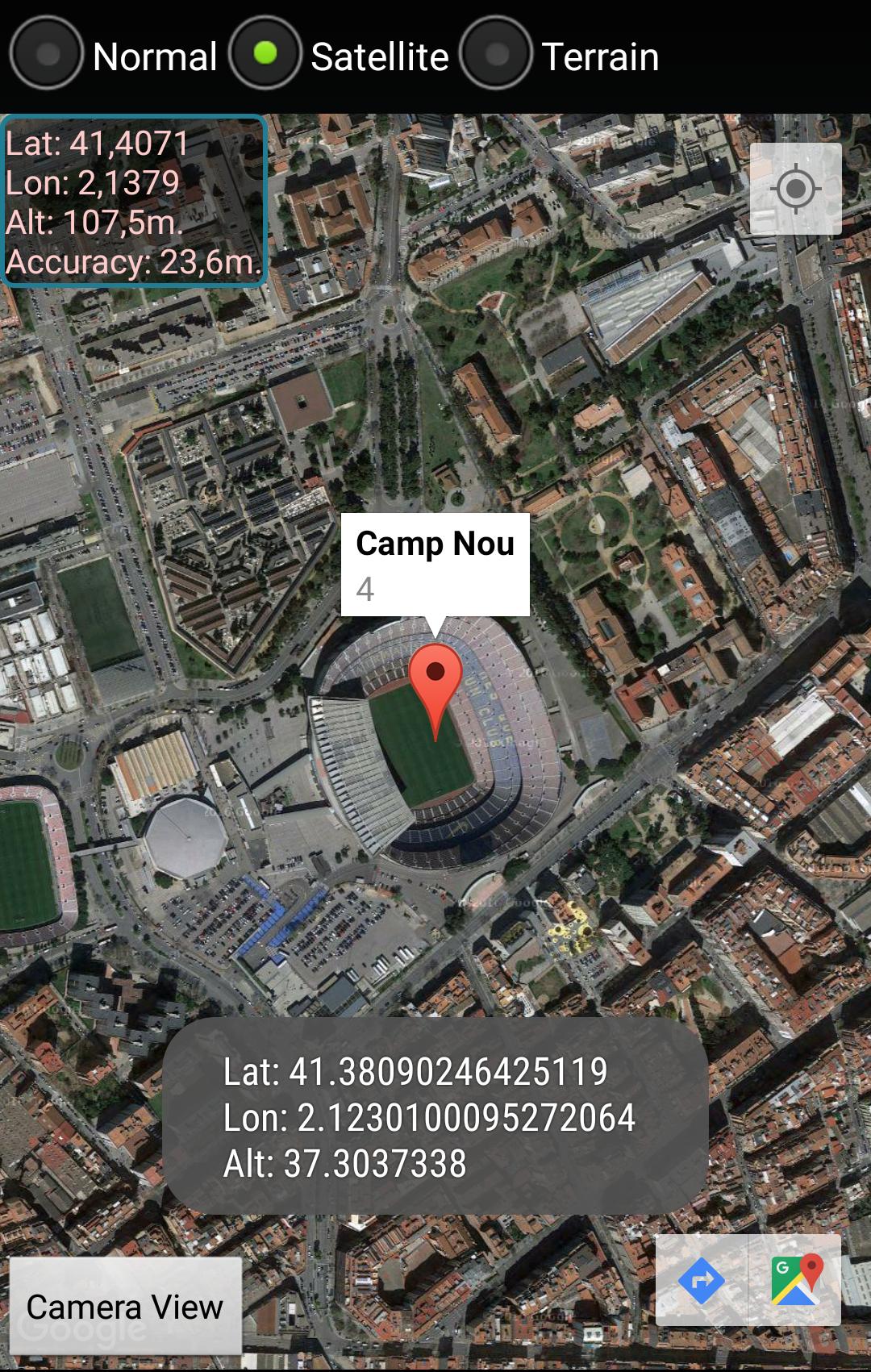 The camera view allows us to see the close points (up to 10km away) with respect to the current position by Augmented Reality. As we move the relative distance to the points is updated in real time.