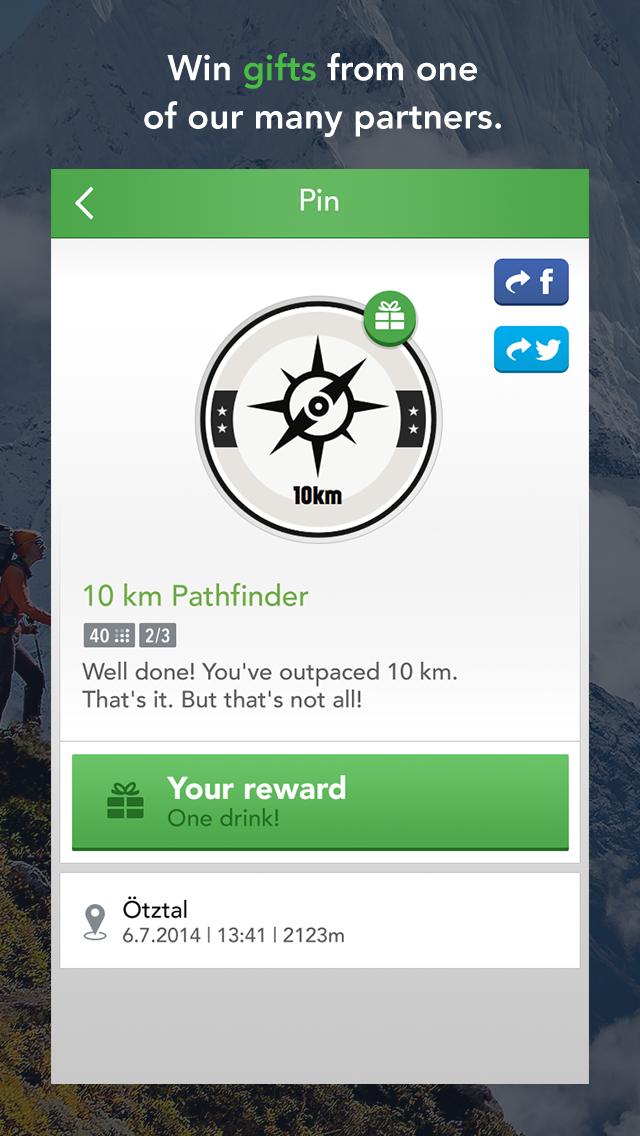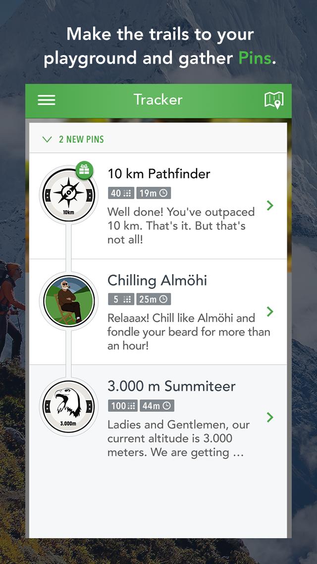 • Get rewarded with badges for your sportive activities: Hike 1.000 vertical meters to collect the 1.000 Vertical-Meters-Badge, for example. There are also badges to unlock on specific daytimes or location-based events