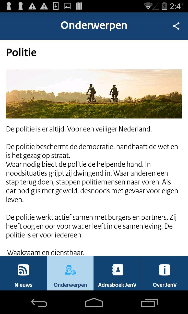 Always the latest news and current information about justice and safety within reach? Download the free app and find the latest news, social media, popular topics, addresses and the most frequently asked questions in one app.