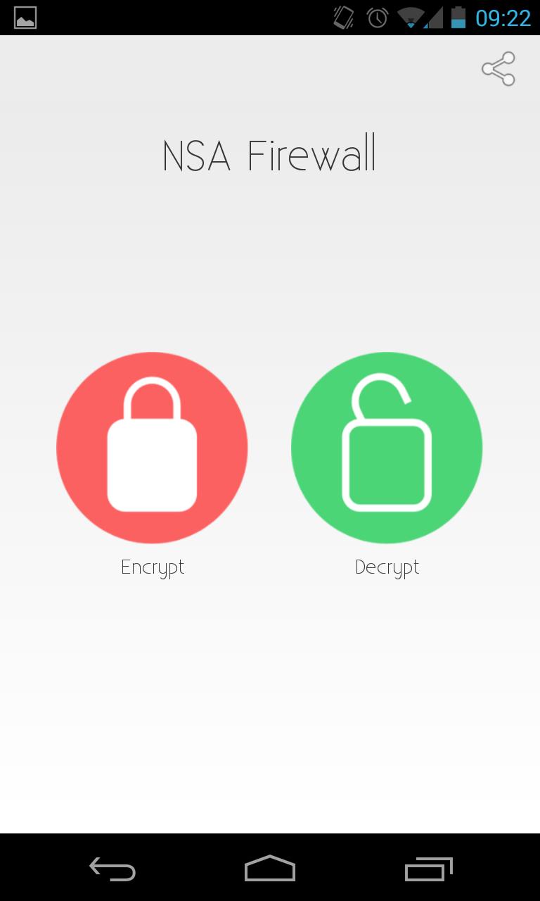 With the NSA Firewall, you can encrypt and decrypt any text. You can send these encrypted messages via text-message, WhatsApp for Facebook with no hassle. The recipient can only read the message, if he/she knows your secret password. If somebody should intercept the message, all he gets is gibberish.