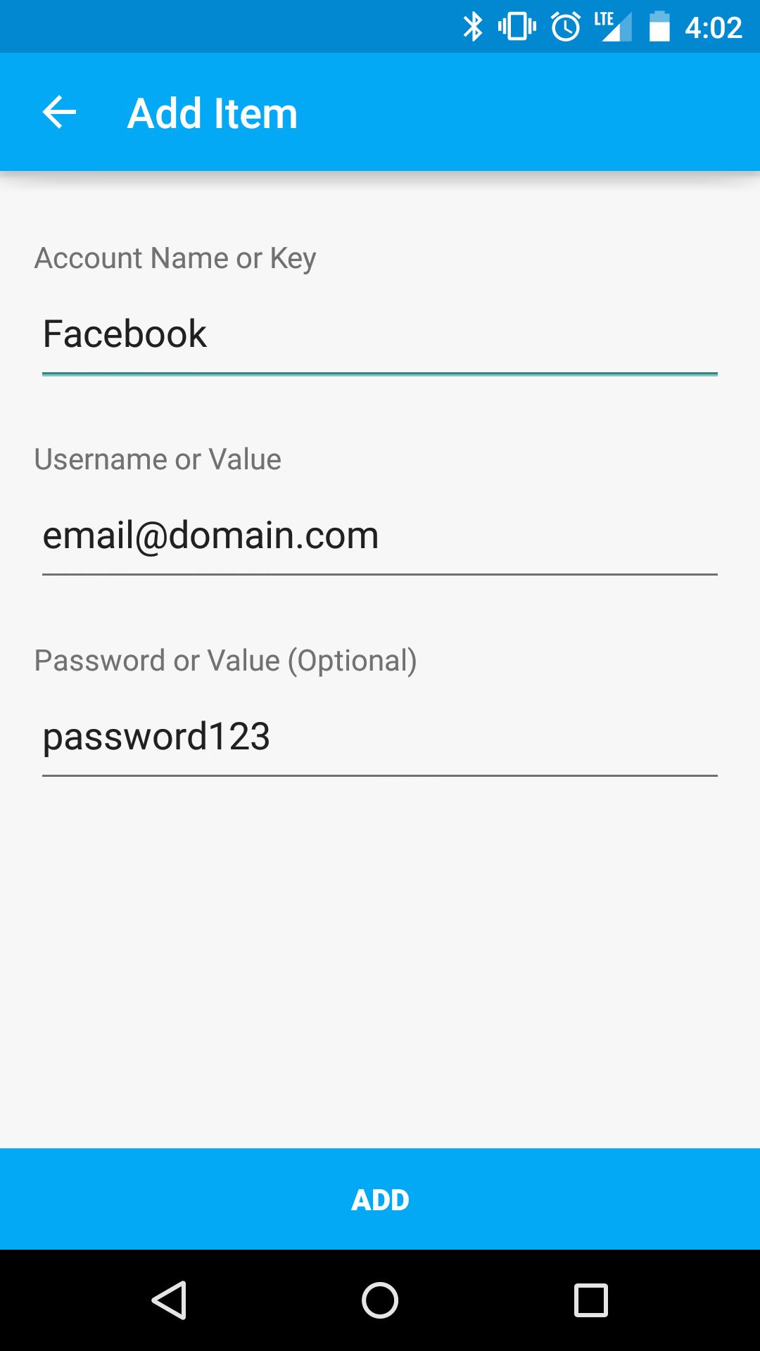 When adding an entry, you'll notice the fields are labeled Key, Value, and Value (Optional). Use the Key field to specify what exactly you're trying to save. If it's your Facebook password, type Facebook. The two value fields can be used for username and password, respectively.