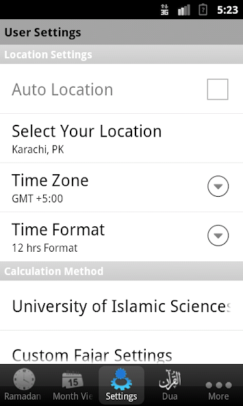 * Alarm options can be set to start selected minutes before Iftar/Sehar.