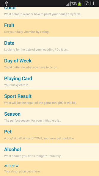 You can't decide what color of clothes to wear today or the date of your wedding? Or you simply want to get a lucky number? Then try Random Stuff - random generator and decision maker.