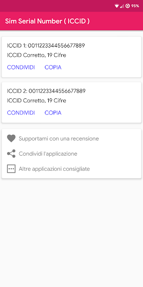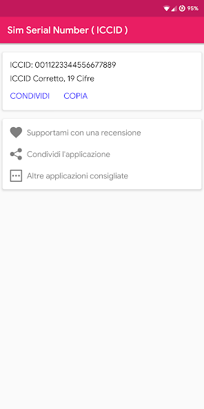 Sim Serial Number, a simple application to read the ICCID code that is usually written on the back of the sim, often happens that this is cut (for passing to micro sim for example) or that for one reason or another is no longer readable, and here comes Sim Serial Number, an application that allows you to read the code from your Sim without even having to remove it from the phone, just a click, and if you need to communicate it to someone, the convenient "share" and "copy" are right for you!