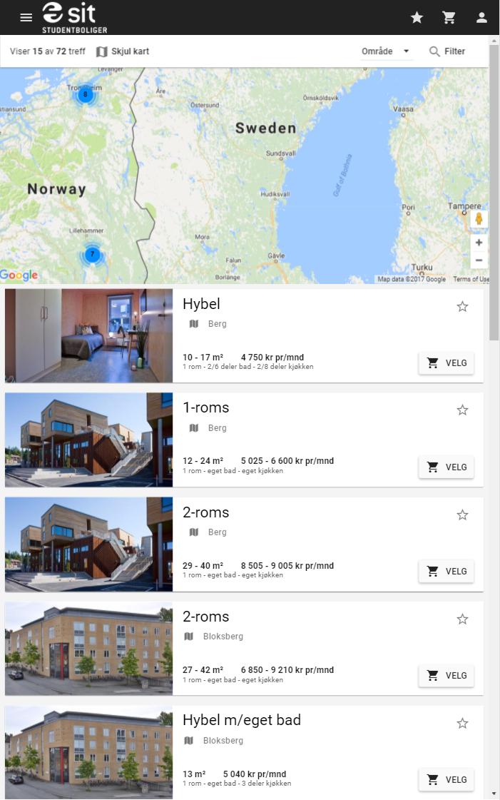 With the app you can find information about and see all the homes for SiT, as well as search for them. In the app you will also be offered housing, the opportunity to pay a deposit and signing of leases with BankID.