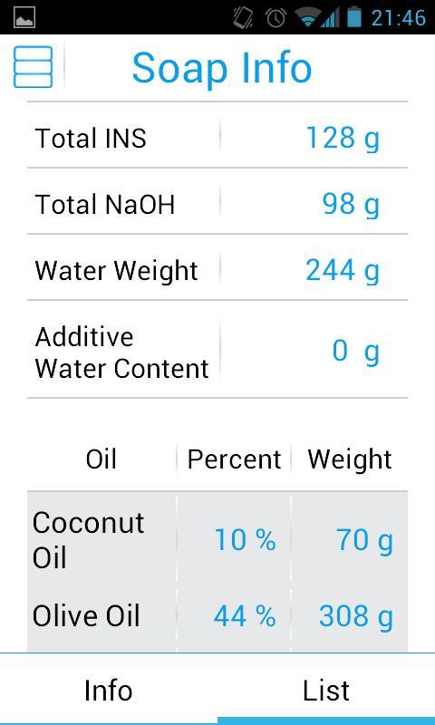 Soap Book could be your best assistant of making soap. It contains built-in soap, oil and additives, also provides taking picture and share on Facebook. You can define your soap, oil or additives to customize the parameters which will be calculated automatically such as Total Soap Weight, Oil Weight, Additive Weight, Total INS Value, Total NaOH Value and Content Water and so on. Showing tips or error messages properly. Even though you are a beginner of making soap, you can make a perfect homemaking soap by yourself. No need to write on a piece of paper anymore. Just take a picture to share with your friends and family.