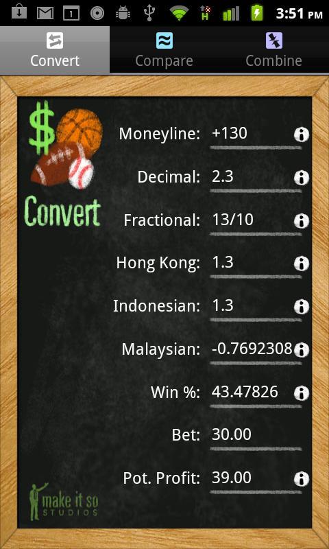 This app is useful for betting on any sport, including football, soccer, baseball, basketball, hockey, golf, and horse racing. Often when you look at odds from different bookies or sites, they are in different formats, especially ones based in different countries or continents. This app will help you with the conversion and tell you where you are getting the best value.