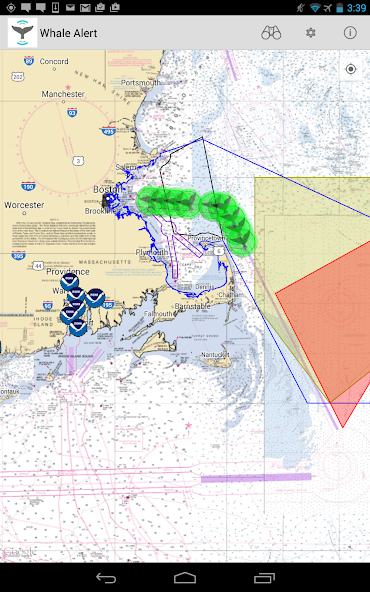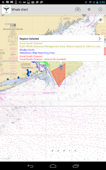 Whale Alert helps reduce the chance of fatal ship strikes by large vessels by displaying active whale management areas, required reporting areas, recommended routes, areas-to-be-avoided and near real-time warnings in shipping lanes along both coasts of the United States and Canada. This information allows vessel operators to avoid collision with whales by slowing down and heightening their visual awareness.