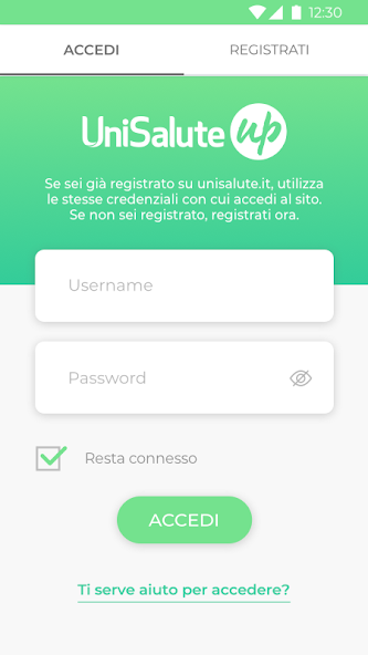للوصول إلى وظائف التطبيق Unisalute ، أدخل اسم المستخدم وكلمة المرور التي تستخدمها بالفعل لإدخال منطقة Unisalute. إذا لم تكن مسجلاً بعد ، فيمكنك أيضًا التسجيل على التطبيق.