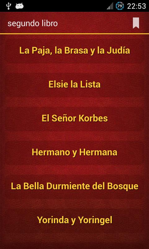 segundo volumen: La Paja, la Brasa y la Judía, Elsie la Lista, El Señor Korbes, Hermano y Hermana, La Bella Durmiente del Bosque, Yorinda y Yoringel, Allerleirauh, El Pastor Sabio, Los Dos Caminantes, El Doctor Sábelotodo, El Erizo y el Esposo de la Liebre, Los Duendes, El Mantel, la Mochila, el Sombrero y el Cuerno, El Campesino y el Diablo, Piel de Oso, La Abeja Reina, El Enigma, El Azote del Cielo, El Gato con Botas, El Manto,