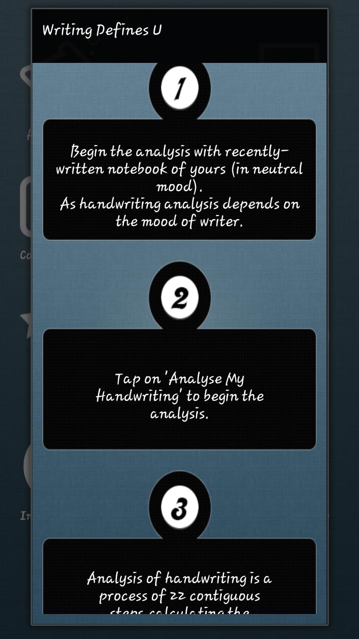 La escritura define U es la aplicación que define las cualidades positivas y negativas de una persona. Es el proceso de 22 paso contiguo que calcula las características de una persona. Graphology es el estudio de la escritura a mano. Como teoría o práctica para comprender el carácter, la disposición y las actitudes de una persona de su escritura a mano, la grafología generalmente se considera pseudociencia.
