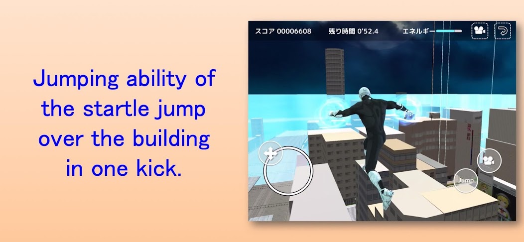 La capacidad de salto del sobresalto salta sobre el edificio en una patada.