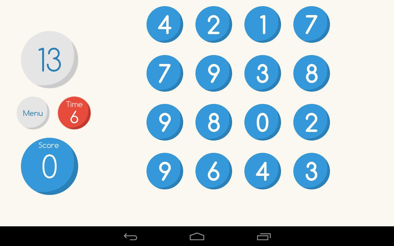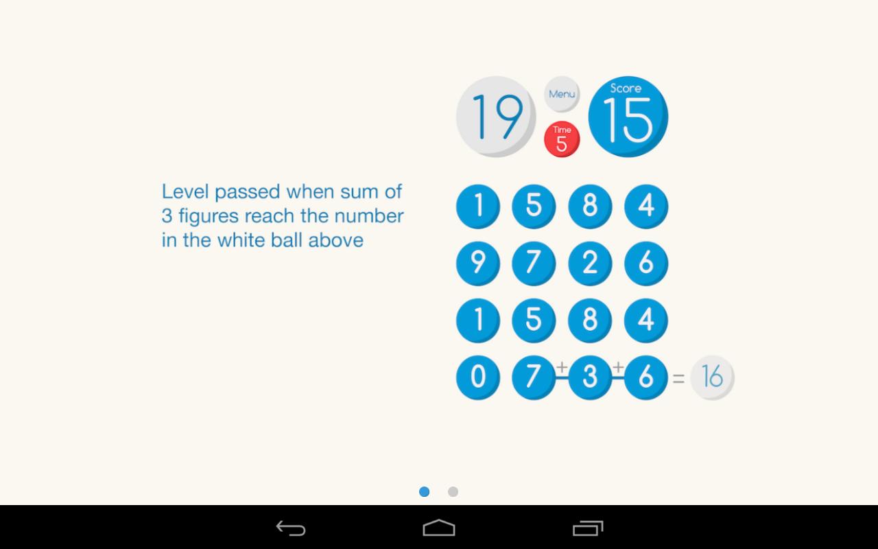 Jugando con matemáticas deslizando 3 figuras horizontalmente, verticalmente o L de forma. El nivel pasó cuando la suma de 3 cifras alcanza el número en la bola blanca.