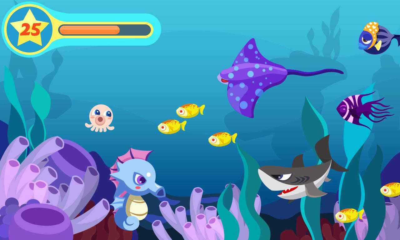 Aguas profundas y tranquilas, los peces se están persiguiendo, traviesos con persecución mágica de burbujas, vienen los peces terribles, todos corren ... Las reglas fundamentales de los peces grandes comen peces pequeños, el mundo del mar.