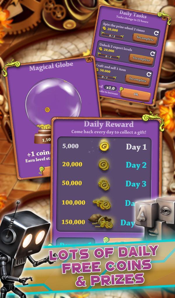 A medida que avanza en su aventura a través del tiempo, descubrirá tesoros raros y valiosos. Recoge todos los azulejos de artesanía para el tesoro y podrás elaborarlo: ¡guárdelo o venderlo, es tu elección! Al final de todos los niveles, tendrá la oportunidad de abrir entre 1 y 3 cofres de bonificación gratuitos. ¿Qué podrían contener? ¿Monedas? ¿Power Ups? ¡Ábrelos y averigüe!