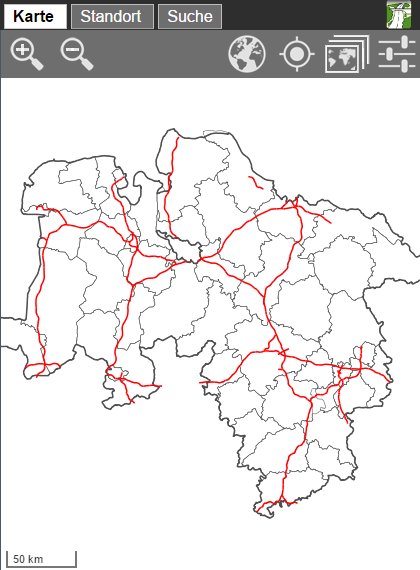 Cette application permet l'affichage du réseau routier classé de la base de données d'informations routières de Basse-Saxe NWSIB-NI.