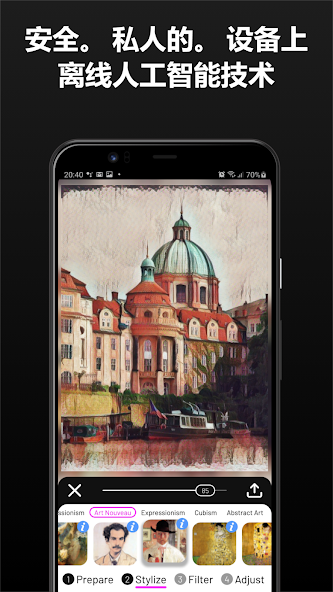 Pas besoin de risquer l'intimité de vos photos car ce studio d'effets utilise des effets d'art profonds AI associés à la technologie TensorFlow. Pour cette raison, il peut fonctionner en mode hors ligne, et vos photos ne quittent jamais votre appareil à moins que vous ne décidiez de les partager!