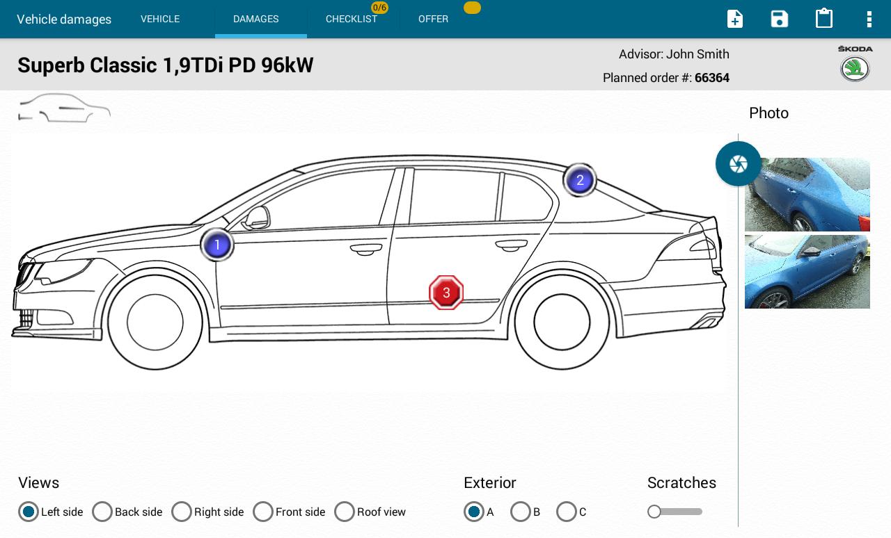 L'enregistrement portable permet une réception électronique dans un service de voiture. Lors de l'enregistrement, Service Advisor a un accès en temps réel dans le système de gestion des concessionnaires concernant les données des clients, les données des véhicules et les données sur l'historique des services. L'enregistrement portable permet de documenter l'état du véhicule - Marquez les rayures et les dommages et faire des photos illustratives. Le processus de réception des véhicules est facile et intuitif - le conseiller de service est guidé à travers des étapes d'enregistrement et ce faisant, des services supplémentaires peuvent être offerts (packages de services standard, services généraux, services différés ou offres saisonnières). Toutes les données collectées sont utilisées comme base pour la création d'un protocole d'acceptation et sont également envoyées au système de gestion des concessionnaires, où sont utilisées pour le traitement des commandes et enregistrées dans l'historique d'un véhicule.