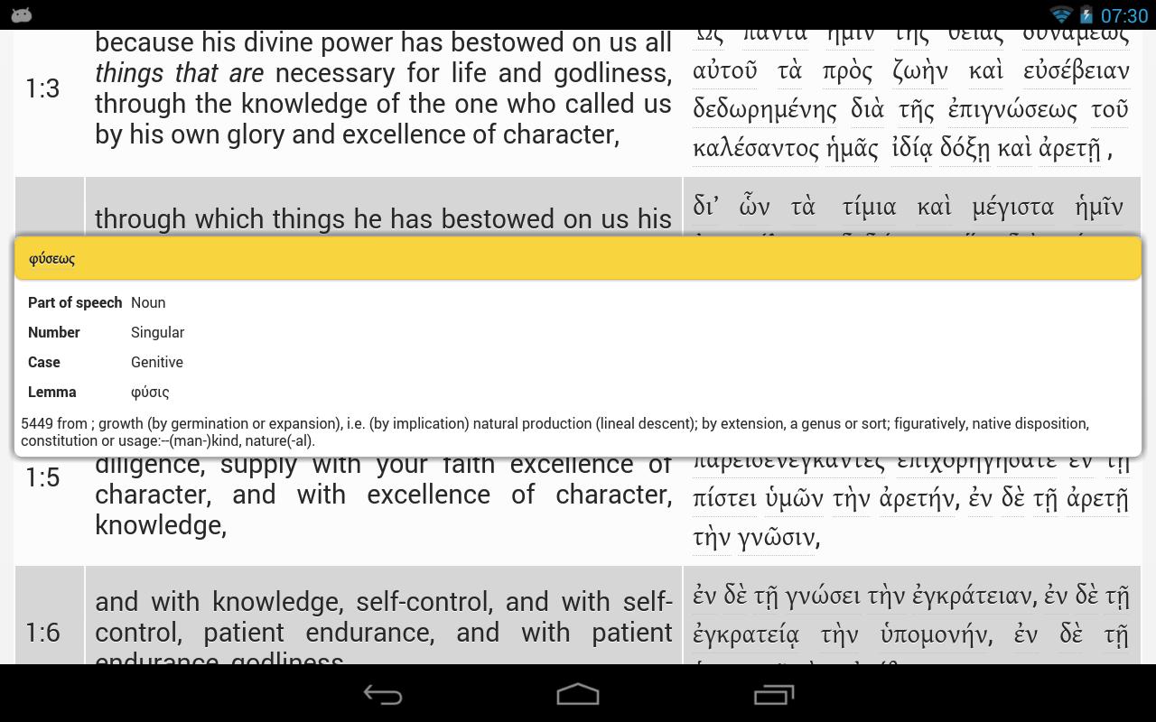 Il présente également une analyse morphologique complète et l'analyse de chaque mot du Nouveau Testament, ainsi que le dictionnaire grec de Strong.