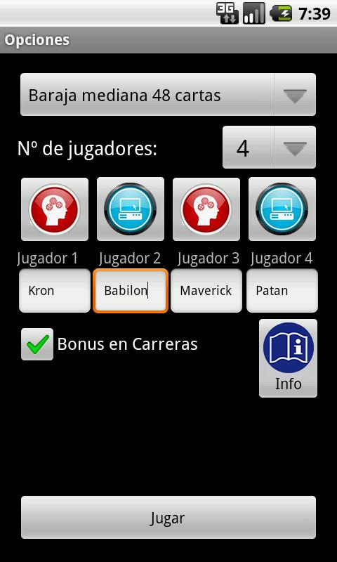 Les jeux sont de 2 ou 4 joueurs, l'utilisateur choisit le nombre d'humains et le nombre de contrôles de la machine. Les noms peuvent être modifiés. L'utilisateur peut choisir la taille du deck et le nombre de joueurs dans le jeu, en cliquant sur les boutons décide s'il s'agit d'humains ou de machines.