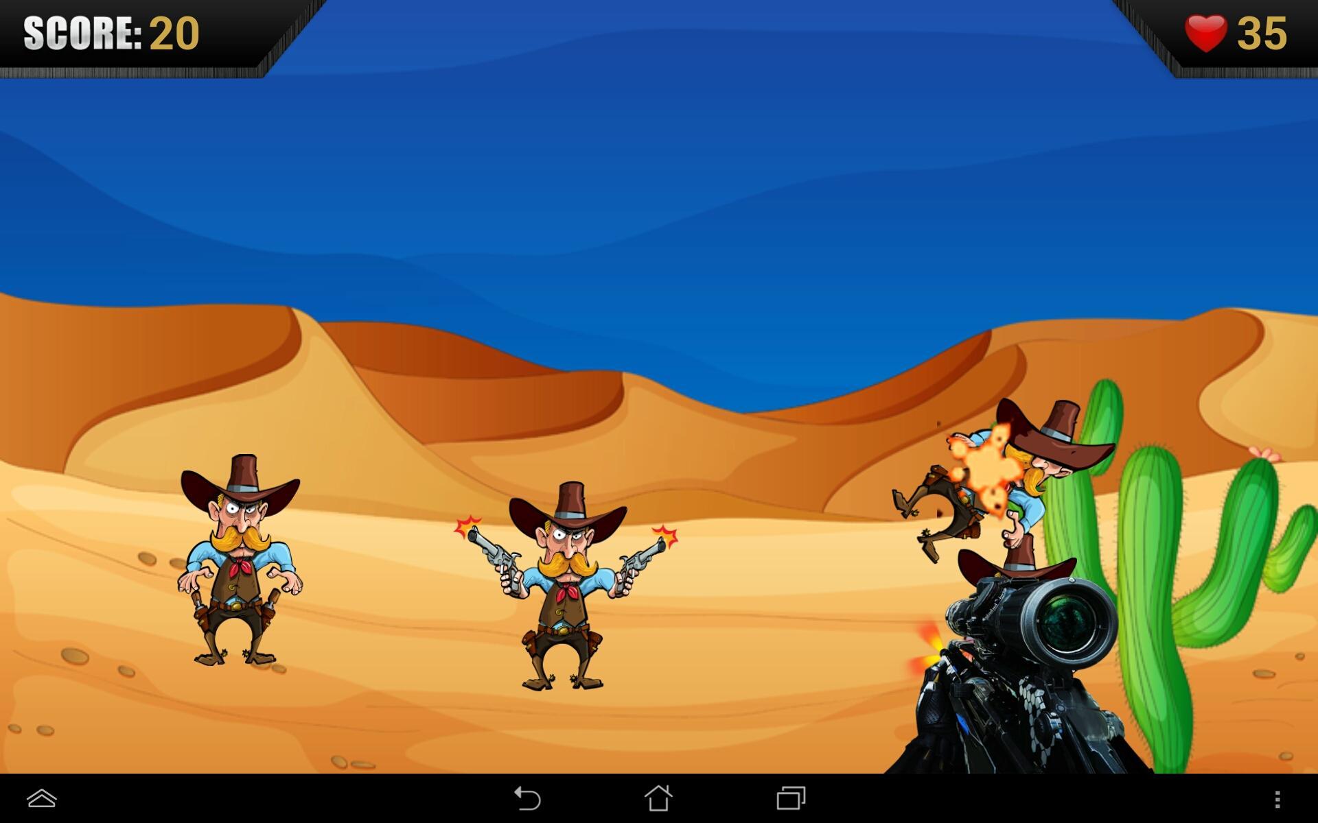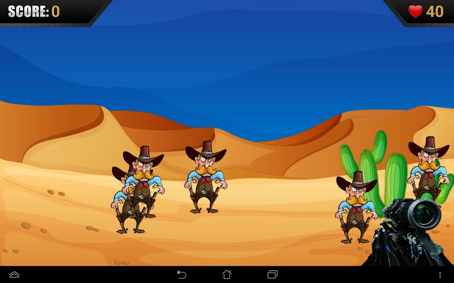 Il s'agit d'une application très passionnante. Ayez un beau fond pour le jeu sur lequel les garçons de vaches aléatoires apparaissent avec un pistolet dans leurs mains pour vous tuer et vous devez les repérer et les tuer pour sauver votre santé. Le score pour chaque fois est affiché qui est en sortie.