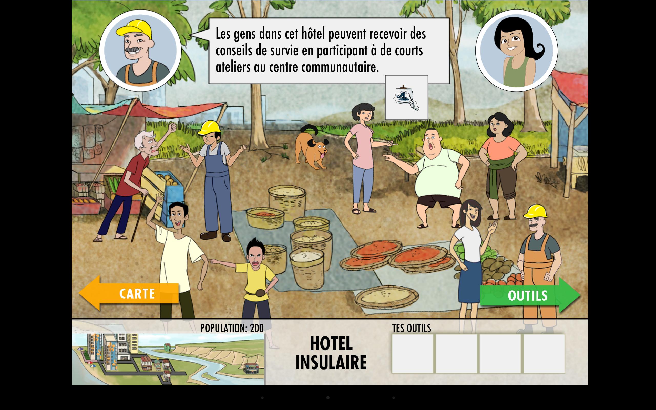 'Earth Girl 2 : Se préparer au tsunami' est un jeu interactif amusant qui consiste à établir des stratégies pour augmenter les chances de survie dans les communautés côtières en cas de séisme suivi d’un tsunami. L’action se déroule dans quatre zones : le marché, la carte, la boîte à outils, et une vingtaine de niveaux de jeu offrant des scénarios d’évacuation. La convivialité du jeu encourage l’exploration proactive à la découverte de ces scénarios, tandis qu’Earth Girl et les villageois fournissent des connaissances, des conseils et des commentaires tout au long du jeu. Chaque niveau de jeu offre la possibilité : d’assimiler des connaissances sur le risque de tsunami en parlant aux gens du marché, de choisir des outils en fonction d’un budget donné, d’explorer le site où va se dérouler la simulation et de prendre des décisions stratégiques en fonction des observations effectuées, et de tirer des enseignements en regardant la simulation. Le niveau de succès des joueurs dans ce jeu dépend de leur niveau d’interaction avec la communauté virtuelle.