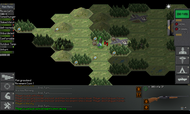Métabolisme réaliste - hypothermie, fatigue, soif, faim, maladie, intoxication, abri ... tout est suivi.
