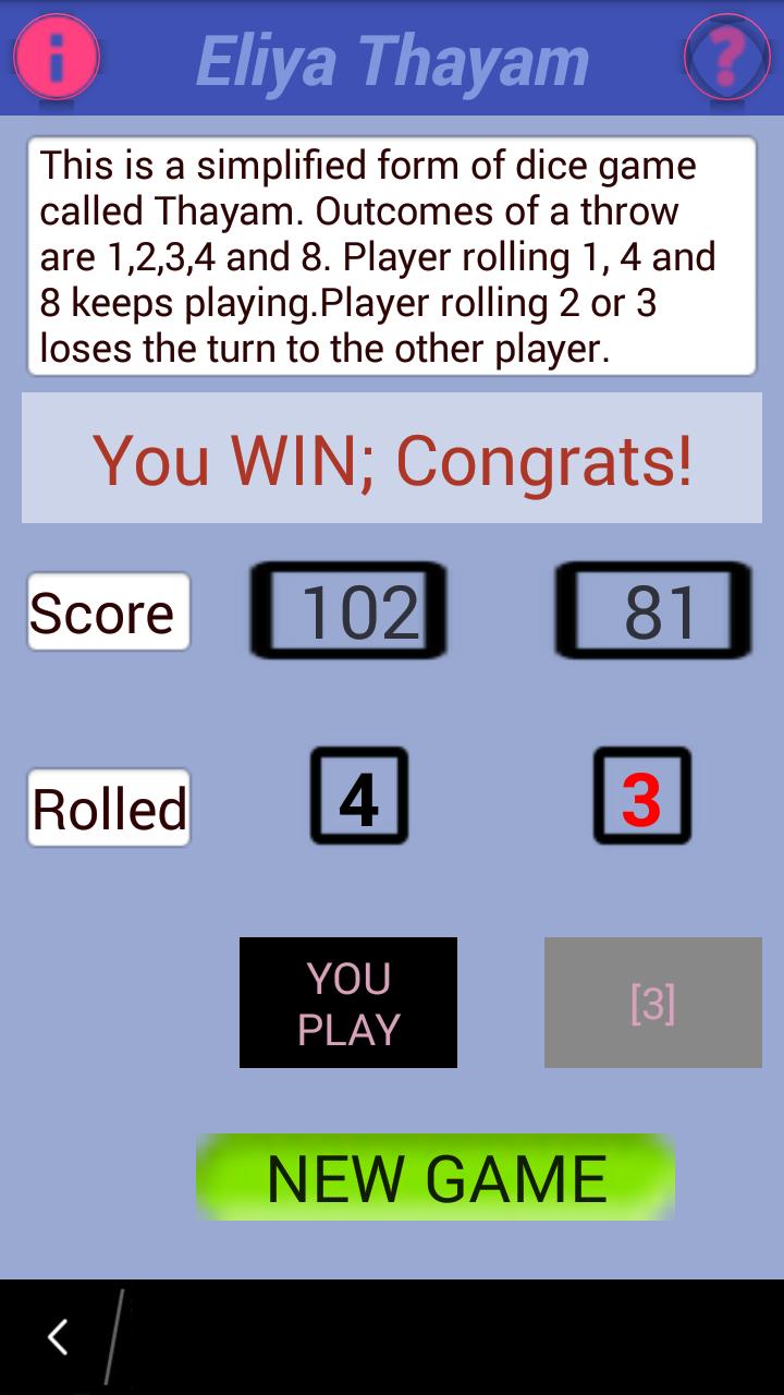Cela se poursuit jusqu'à ce que le joueur ou la machine atteigne le total de 100 et revendiquent une victoire.