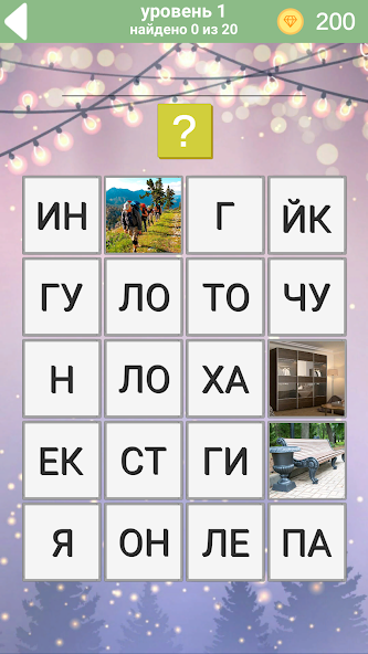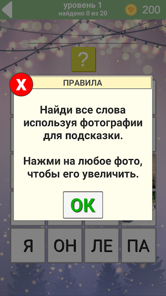 At each level, you have 20 photos available, with which you must guess 20 hidden words to complete the level. Photos are opened one at a time, and you have access to a certain number of photos.as you guess them, others will be available to you. The game is available in 7 languages: English, Russian, Spanish, Italian, Portuguese, German, and French.