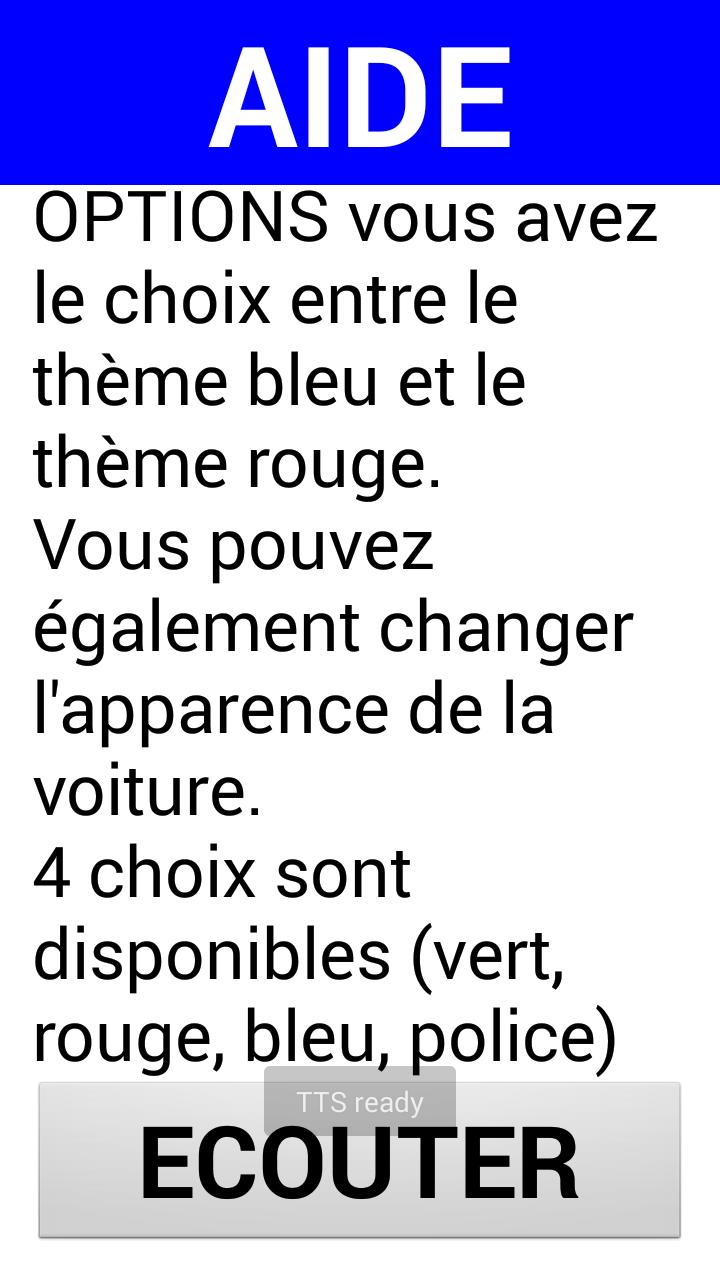 You can change the appearance of the car, change the color of the theme of the game, activated or not the boost when supporting the screen and or not activate sound guidance. It all happens in the options menu. The help menu can be read aloud by pressing "Listening".