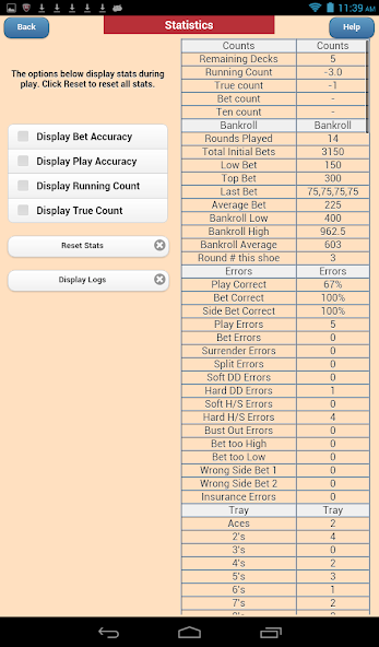 Realistic graphics – Screen space is not wasted on cartoonish graphics, like glowing tables. Useful graphics, cards, shoes and discard trays, are realistic, regulation casino-style, images. For example, there are 228 photo-realistic images of discard trays and shoes merged into a felt table.