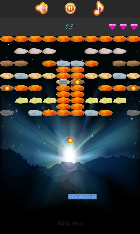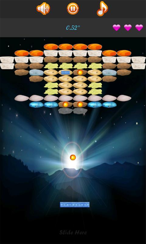 Move the rock paddle with your finger, swiping to the side needed, catch and aim the ball and blast off the rock bricks and head to the next level.
