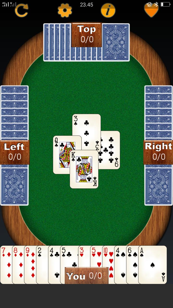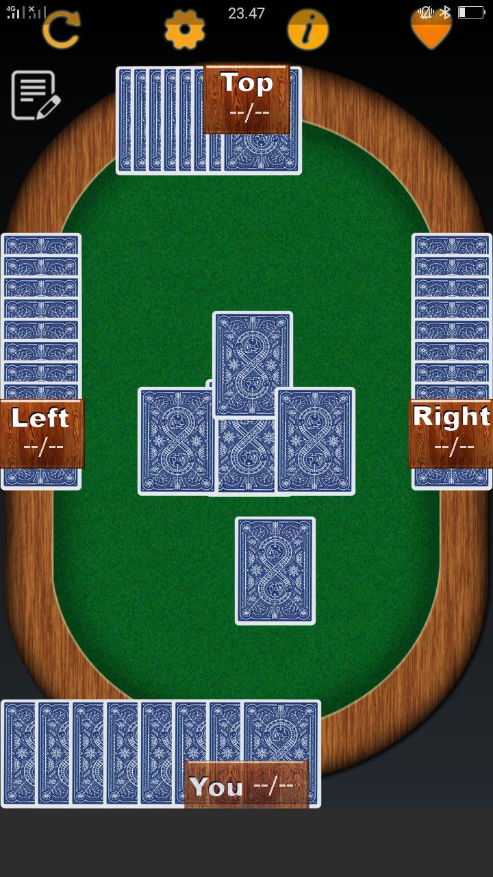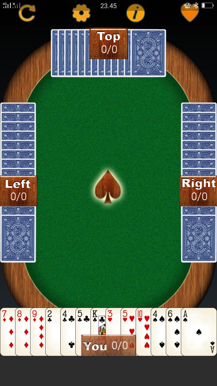 permanent trumps: any card of the Spade suit beats any card of any other suit. Deal and play are counter-clockwise.