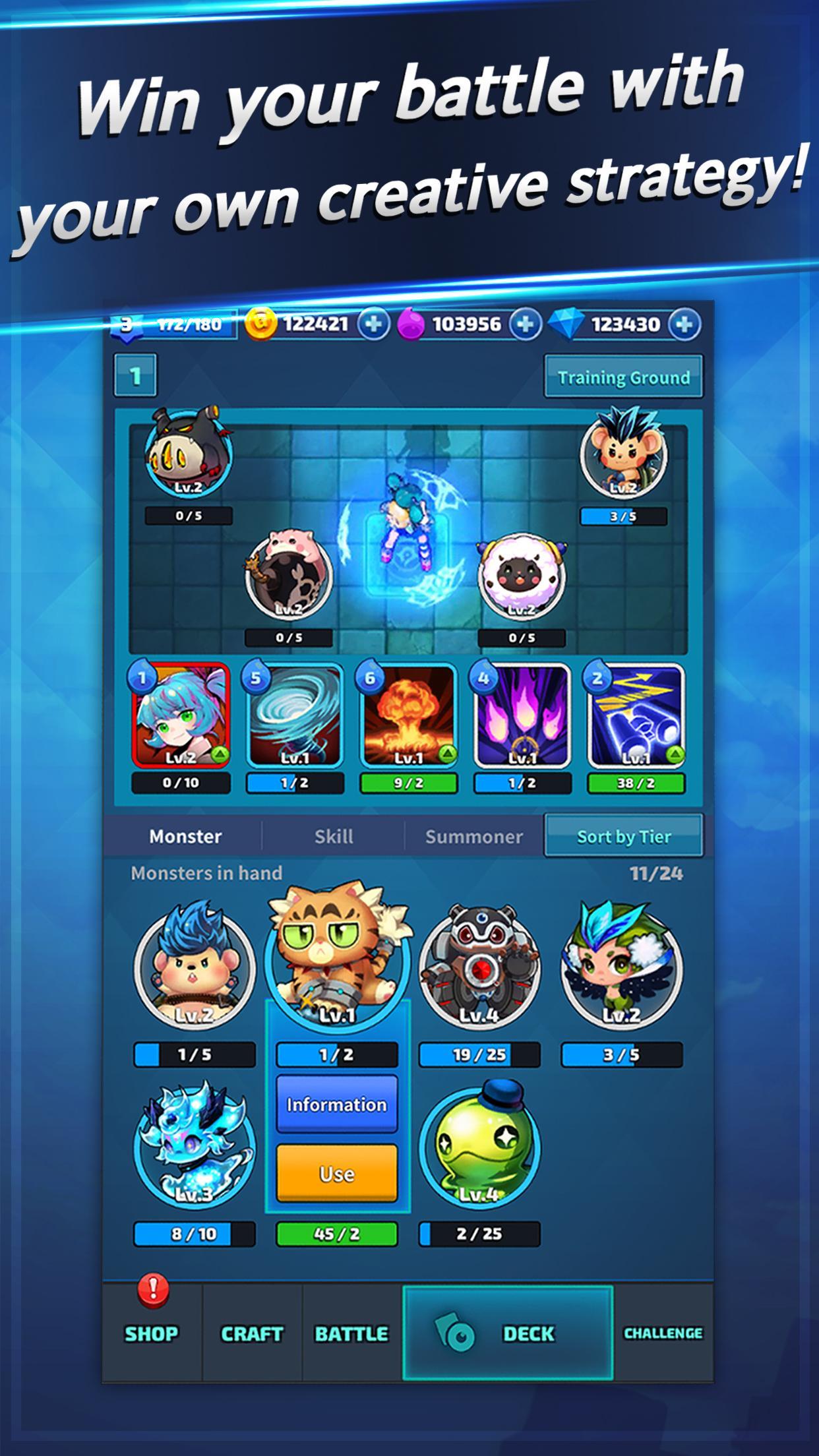 Do not panic with opponent’s attacks. Take your time and focus to identify your opponent’s weak points. Collect mana and use summoner skills at the best timing. If you crave to win, train yourself in the game with various training modes.