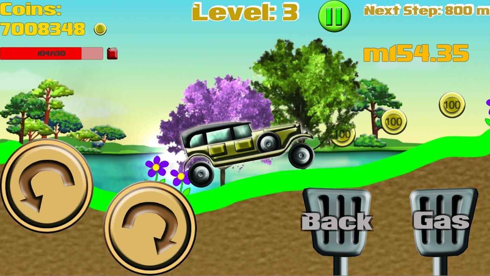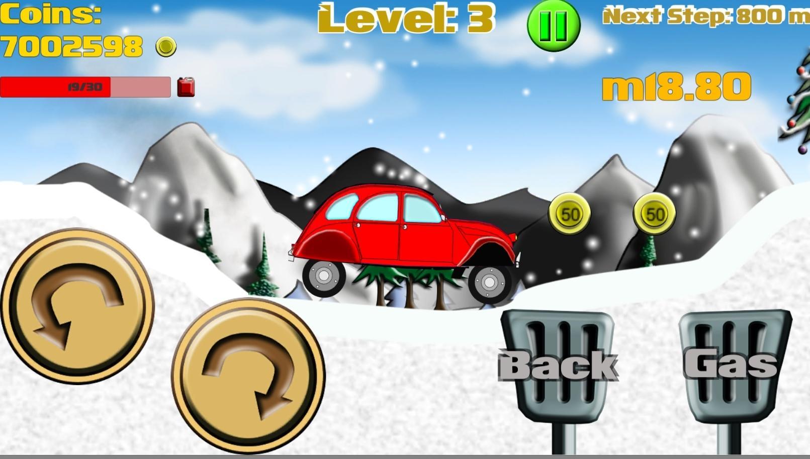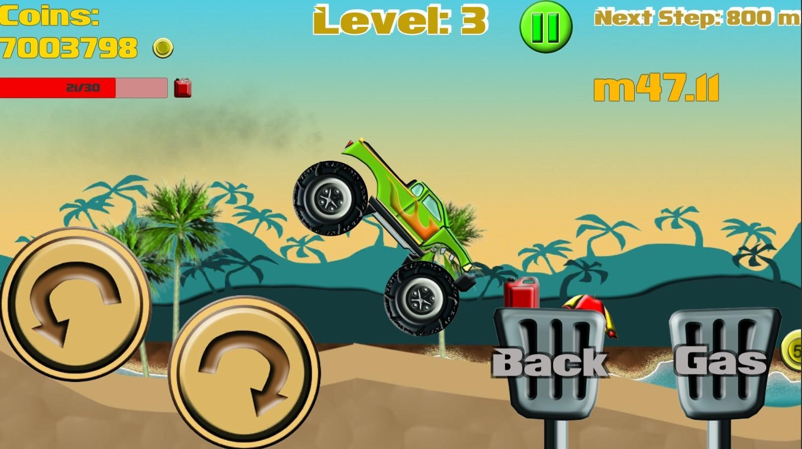 Collect coins to upgrade your car, buy new cars and achieve even greater distances. To achieve each step you will also earn a bonus. But be careful! gasoline may terminate, so you have to go fast to find some fuel around and continue your adventure but it avoids flip the car, the driver could get hurt, and then it would end your ride.
