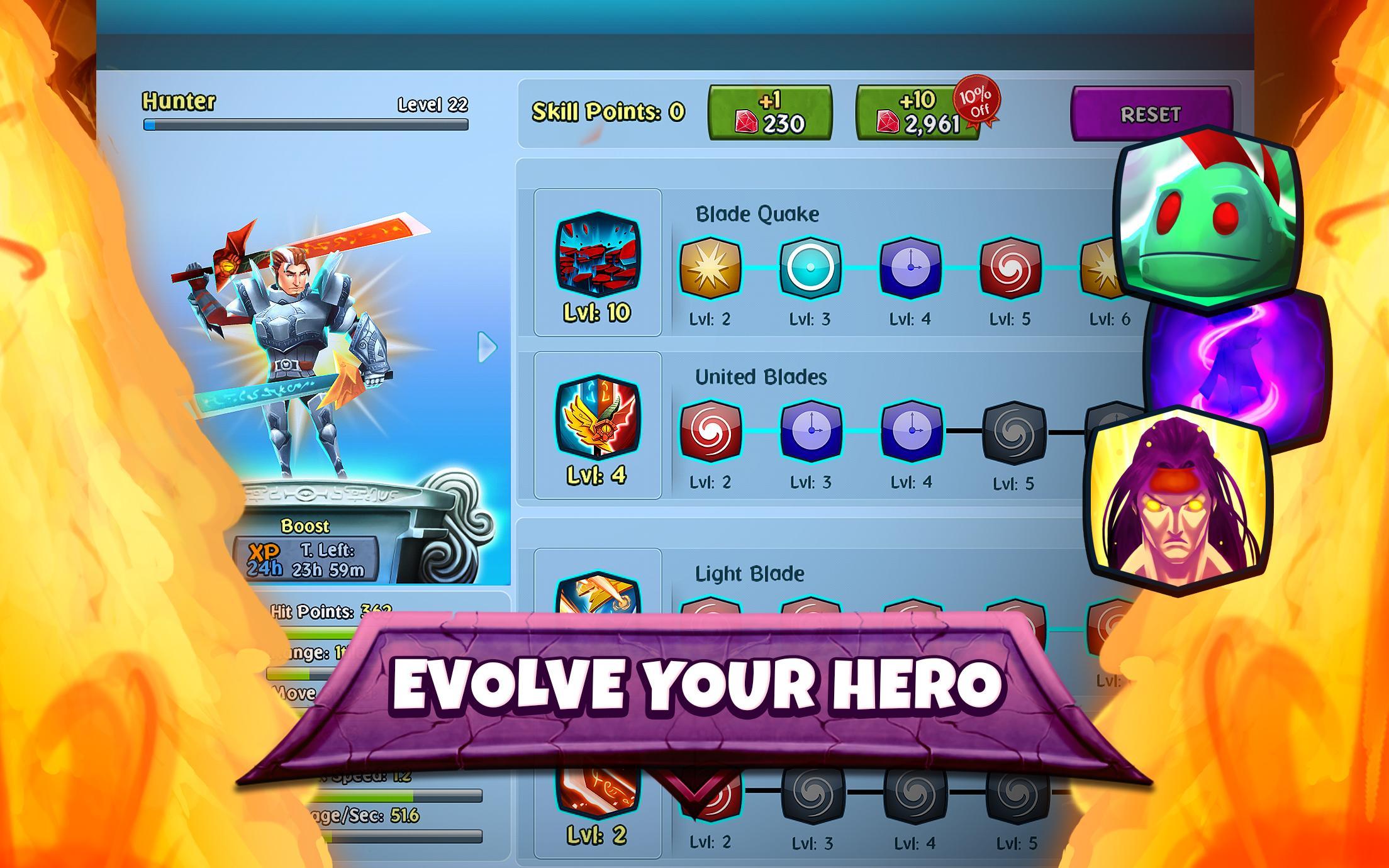 - Level up 5 powerful Heroes with unique abilities and different styles of play