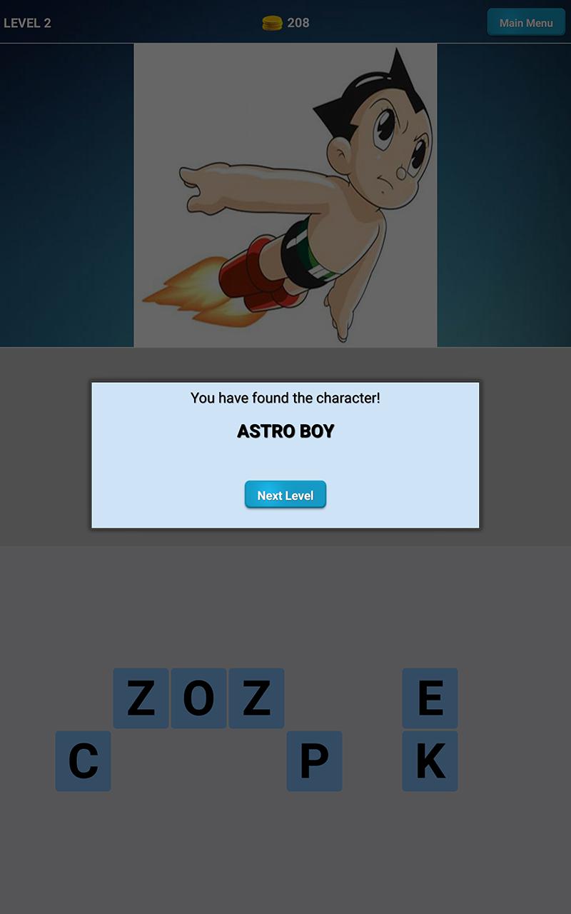 Guess the Cartoon hero in the picture to advance through levels. You can earn coins and spend them with options to skip level, reveal correct letters from cartoon's name or remove unused letters.